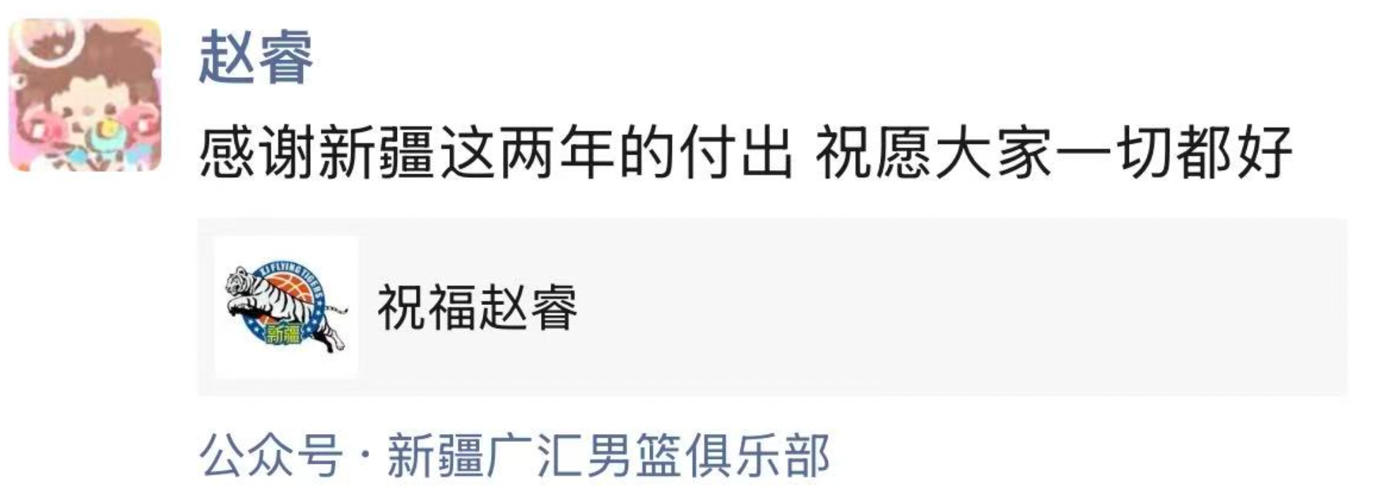 赵睿随后在社交媒体转发了新疆男篮的官方内容,并附上了祝福: