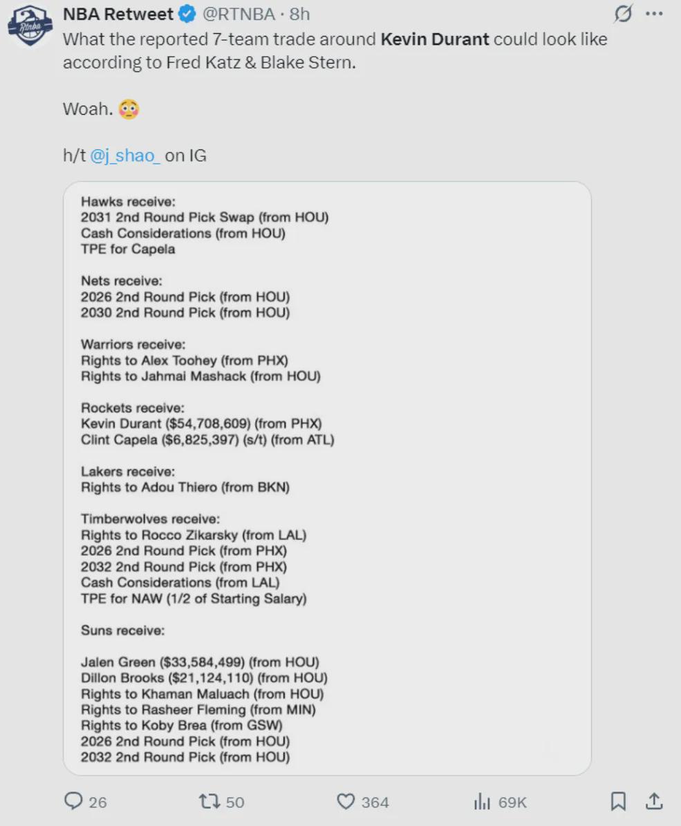 据报道,这一次关于杜兰特的交易已经从火箭和太阳两队扩展到了7队,勇士和湖人也参与了进来。