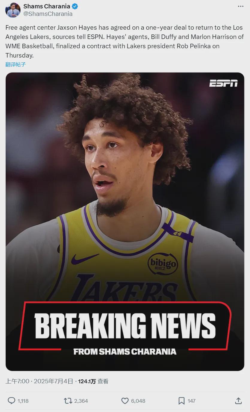 于是在今天,湖人继续补强内线,他们在已经有了艾顿并且报价霍福德的情况下,重新签约了中锋海斯。