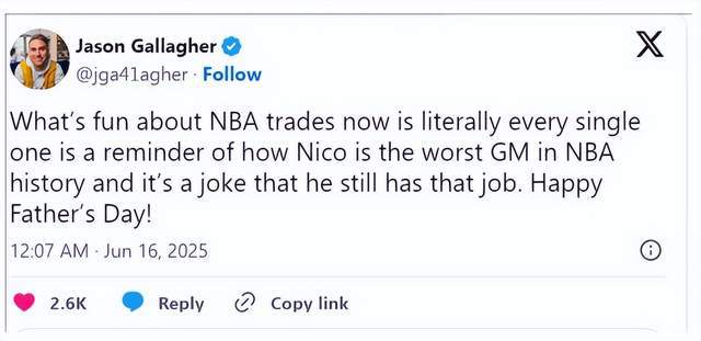 “NBA交易最有趣的地方是,每次交易发生,你都会想起哈里森是多么不合格。而他居然还能继续坐在总经理的位置上,简直是联盟的笑话。”